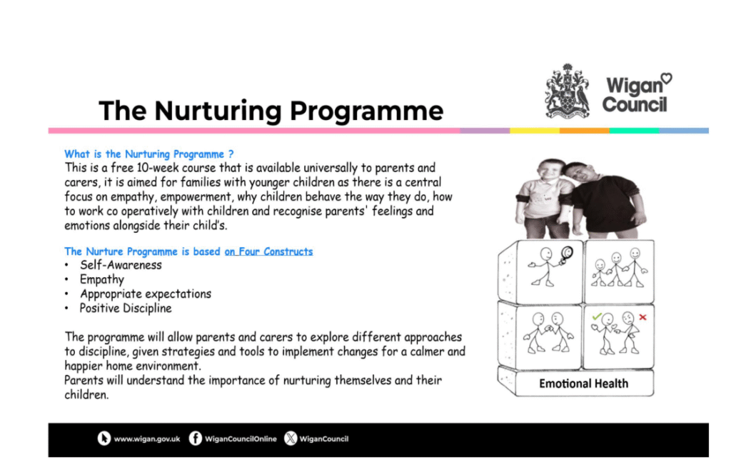 We are delighted to share details of The Nurturing Programme from Wigan Council—a free 10-week course available universally to all parents and carers in our community. Specifically designed for families with younger children, this programme offers a supportive space to explore the “Four Constructs” of effective, heart-led parenting: